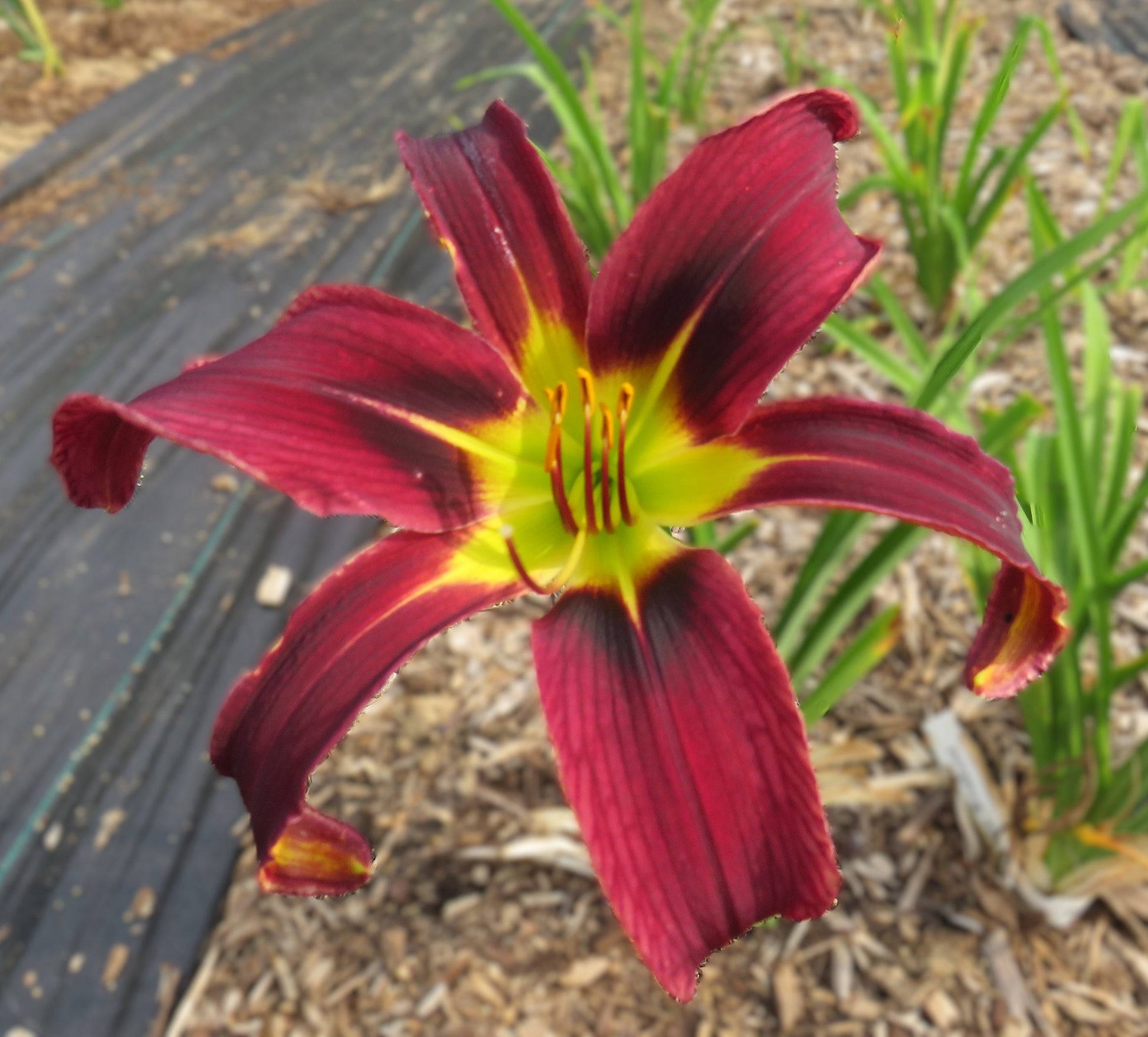 Color: red purple with black eye above green throat