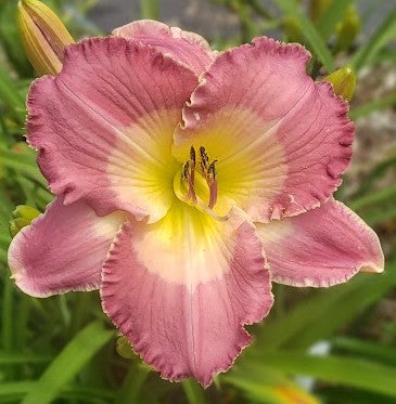 Color: Lightly ruffled lavender with very light lavender watermark, yellow to chartreuse throat, and light lavender sepals.