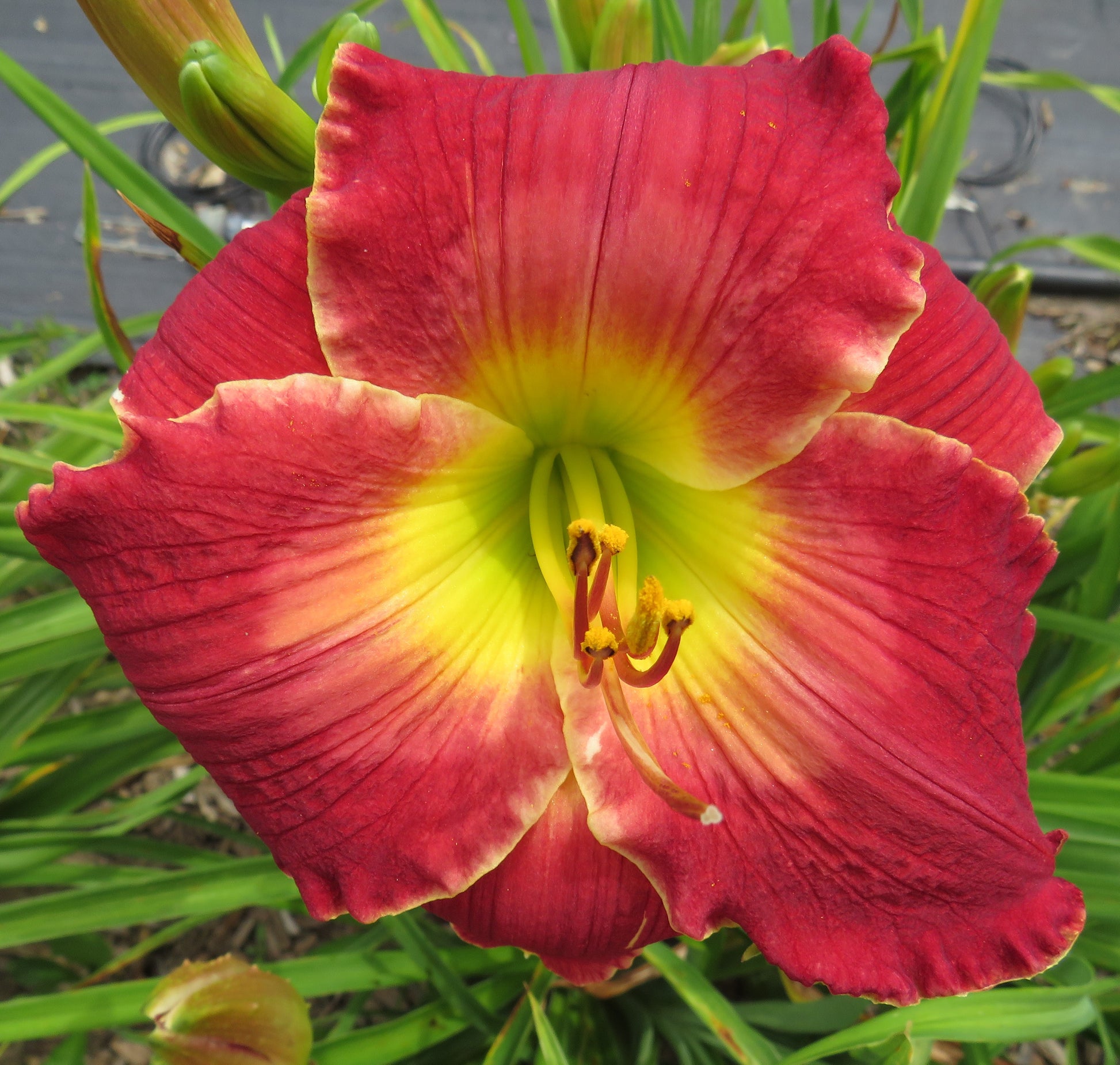 Color: red with yellow edge and lighter red halo above green throat