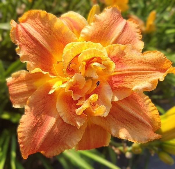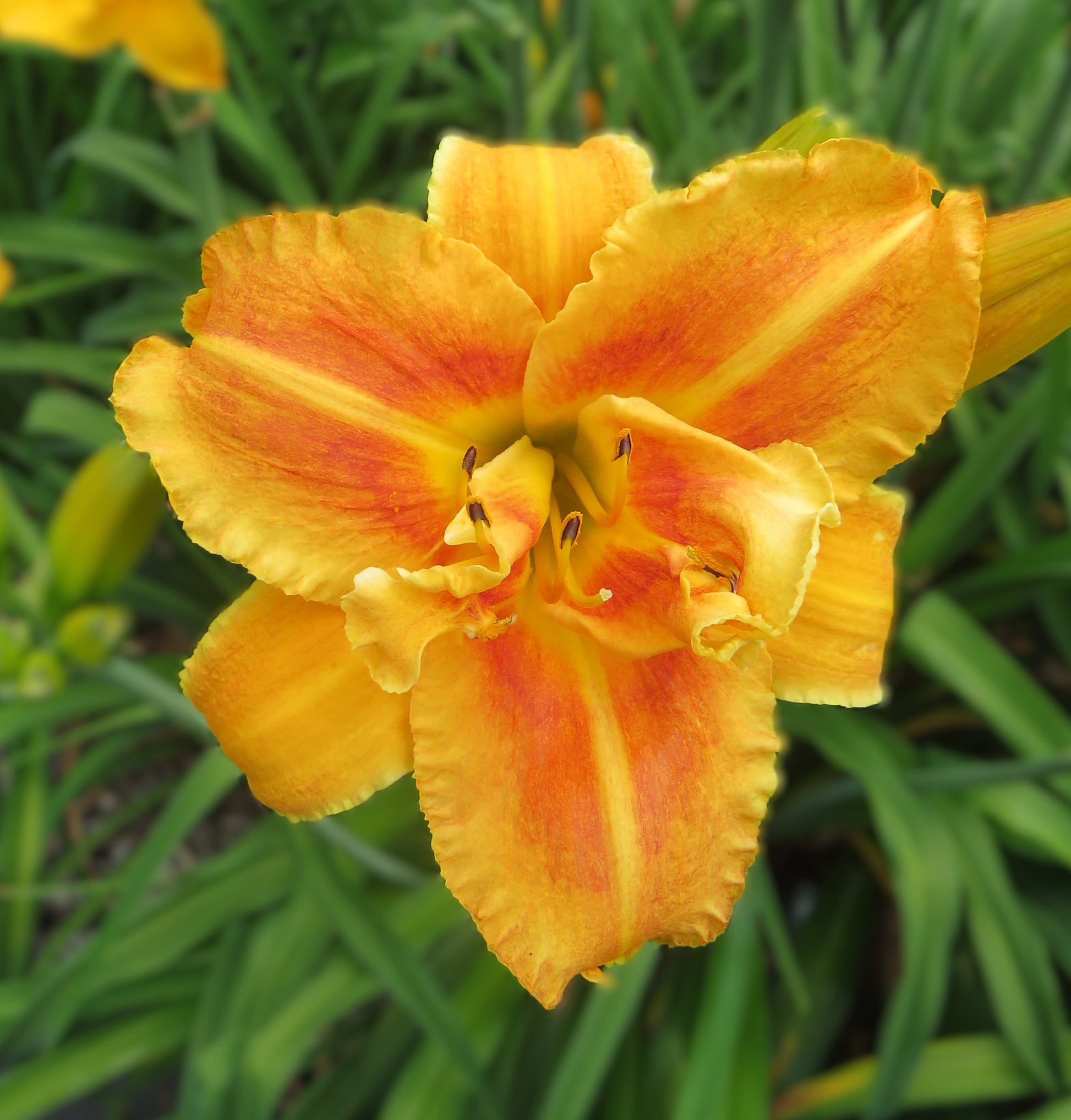 Color: orange yellow petals with yellow borders, colors mixed and flecked, almost streaked, green throat, white midrib, small green throat