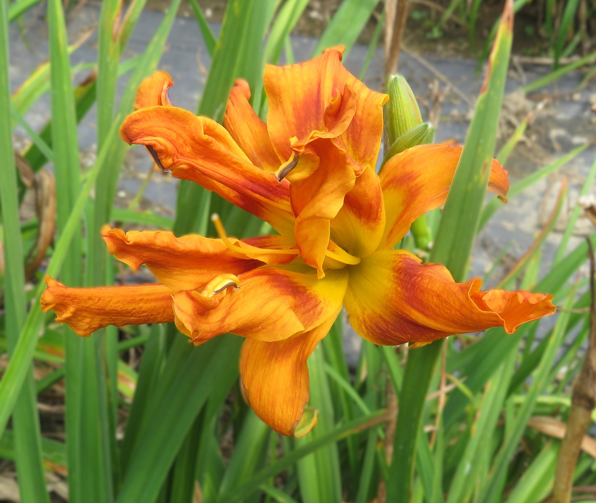 Color: orange gold blend with red orange eye above large yellow green throat